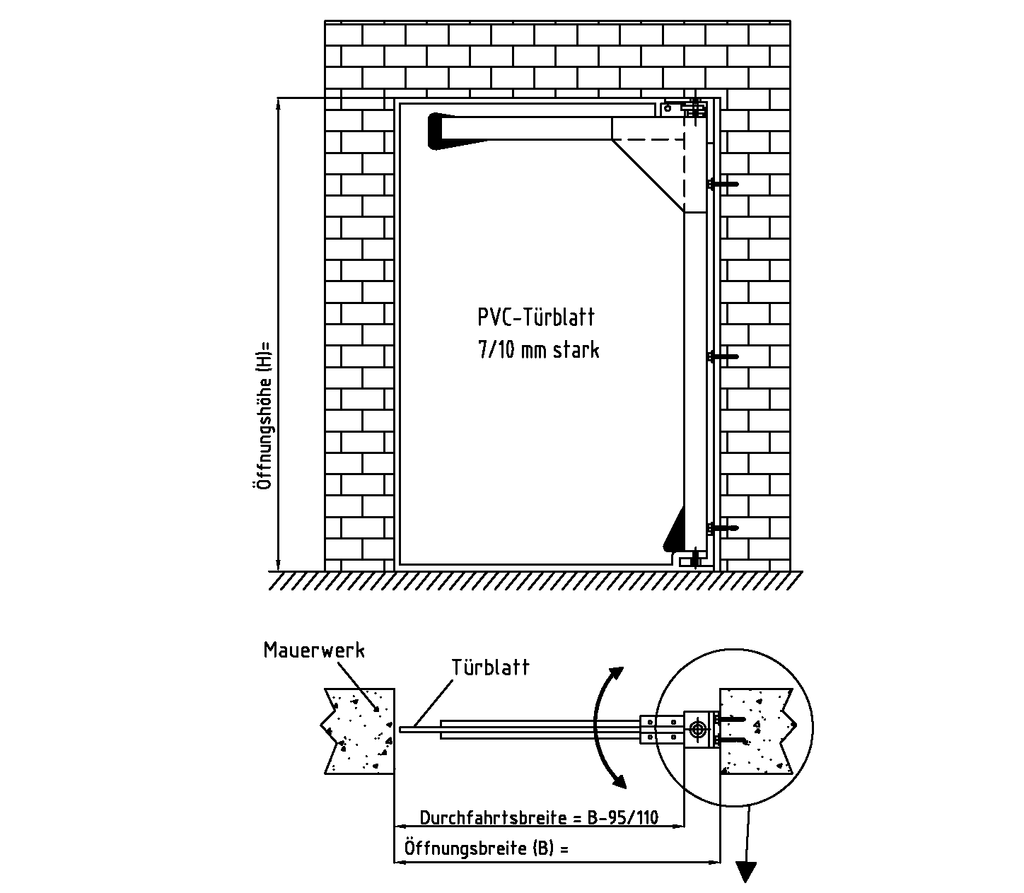 - Türblattoptionen: Transparent in verschiedenen Ausführungen, kältebeständig bis -40°C, mit Gewebeeinlage oder farbigen PVC-Einlagen